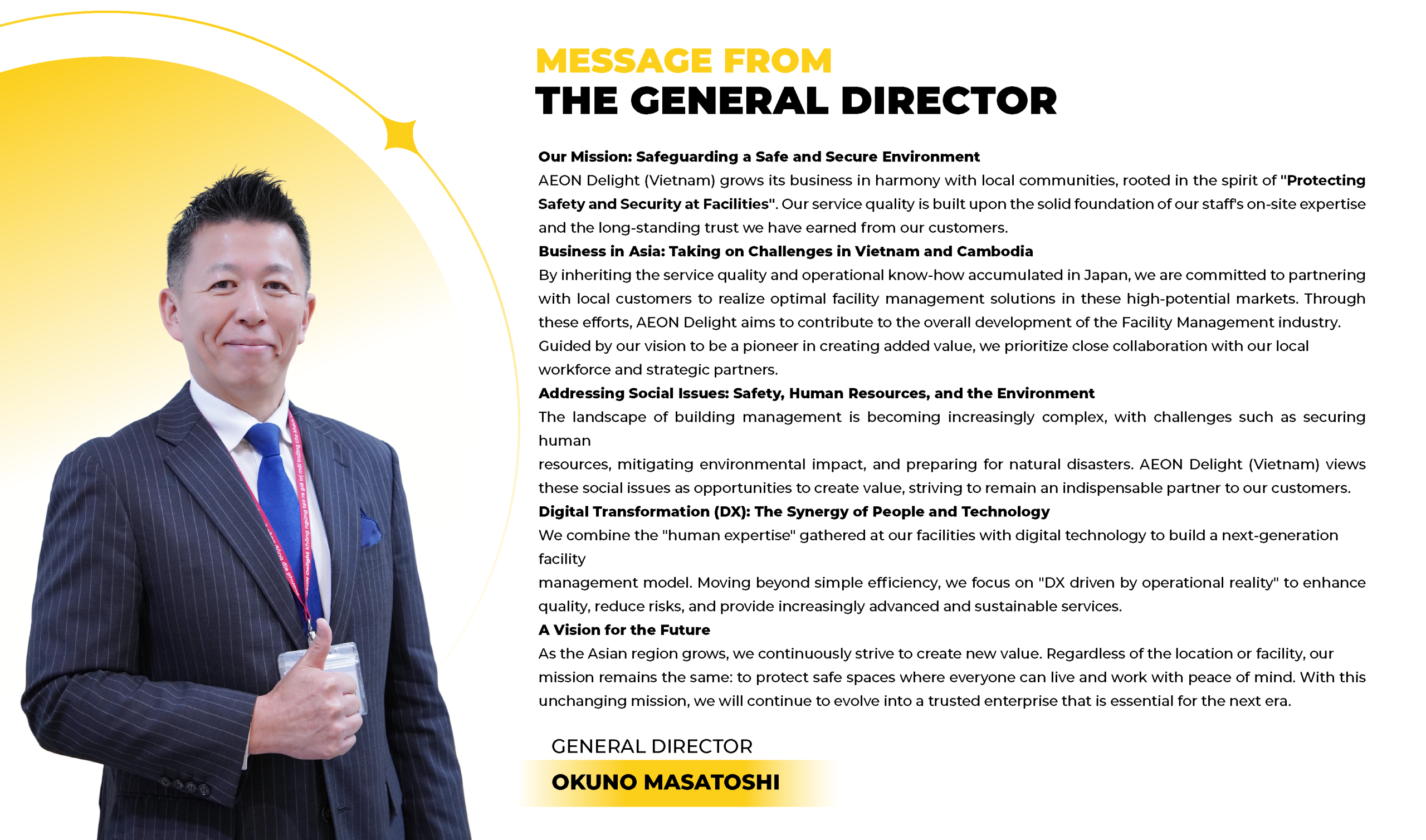 “AEON Delight Vietnam provides the facility management services on the basis of nearly 50 years experience in Japan – providing one-stop, integrated facility management services for diverse customers, such as shopping centers, buildings, offices, residential areas, restaurants, schools, hospitals and industrial sites/factories,… throughout Asia.”