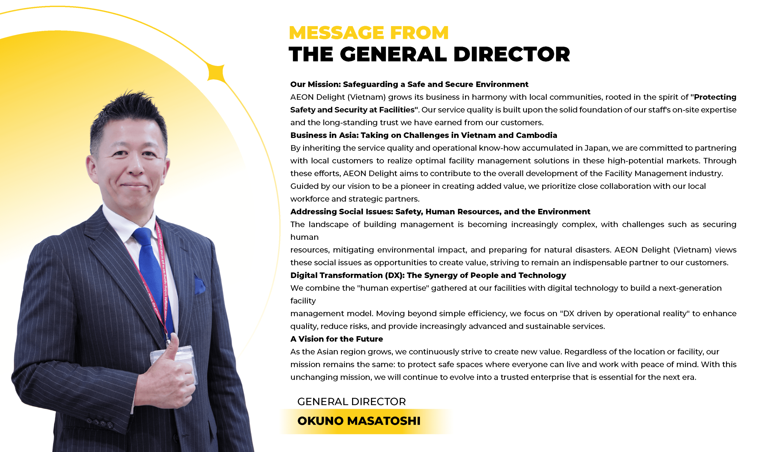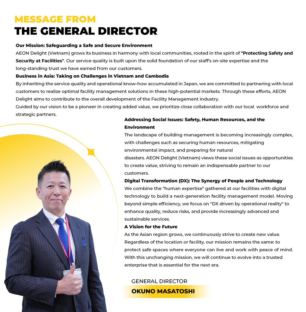 AEON Delight Vietnam and its branch in Cambodia (established in June 2018) collaborate and cooperate with outstanding and potential partners to provide customers with comprehensive facility management solutions, while continuously expanding business domestically, enhancing service quality, and striving to “create environmental value for the local community.