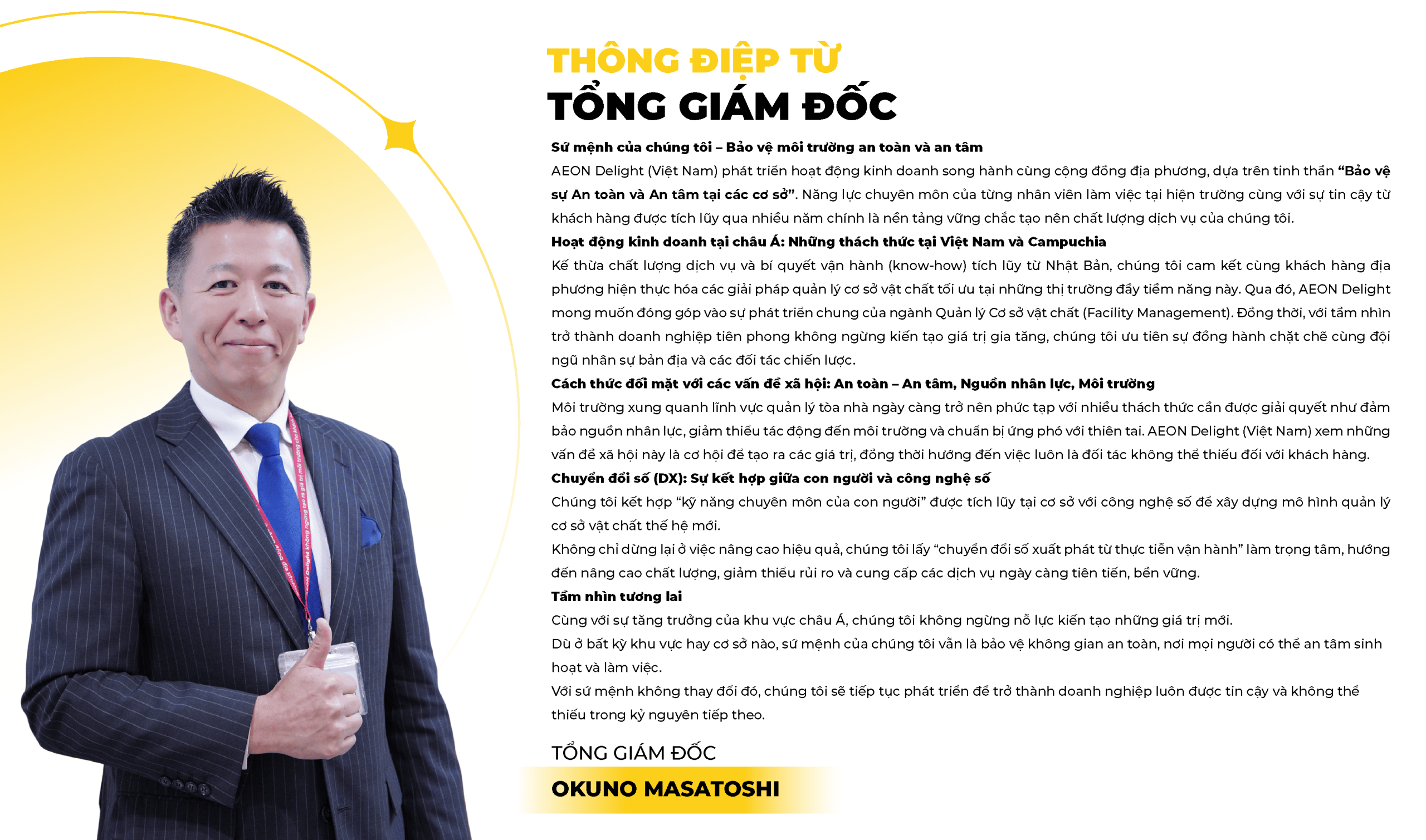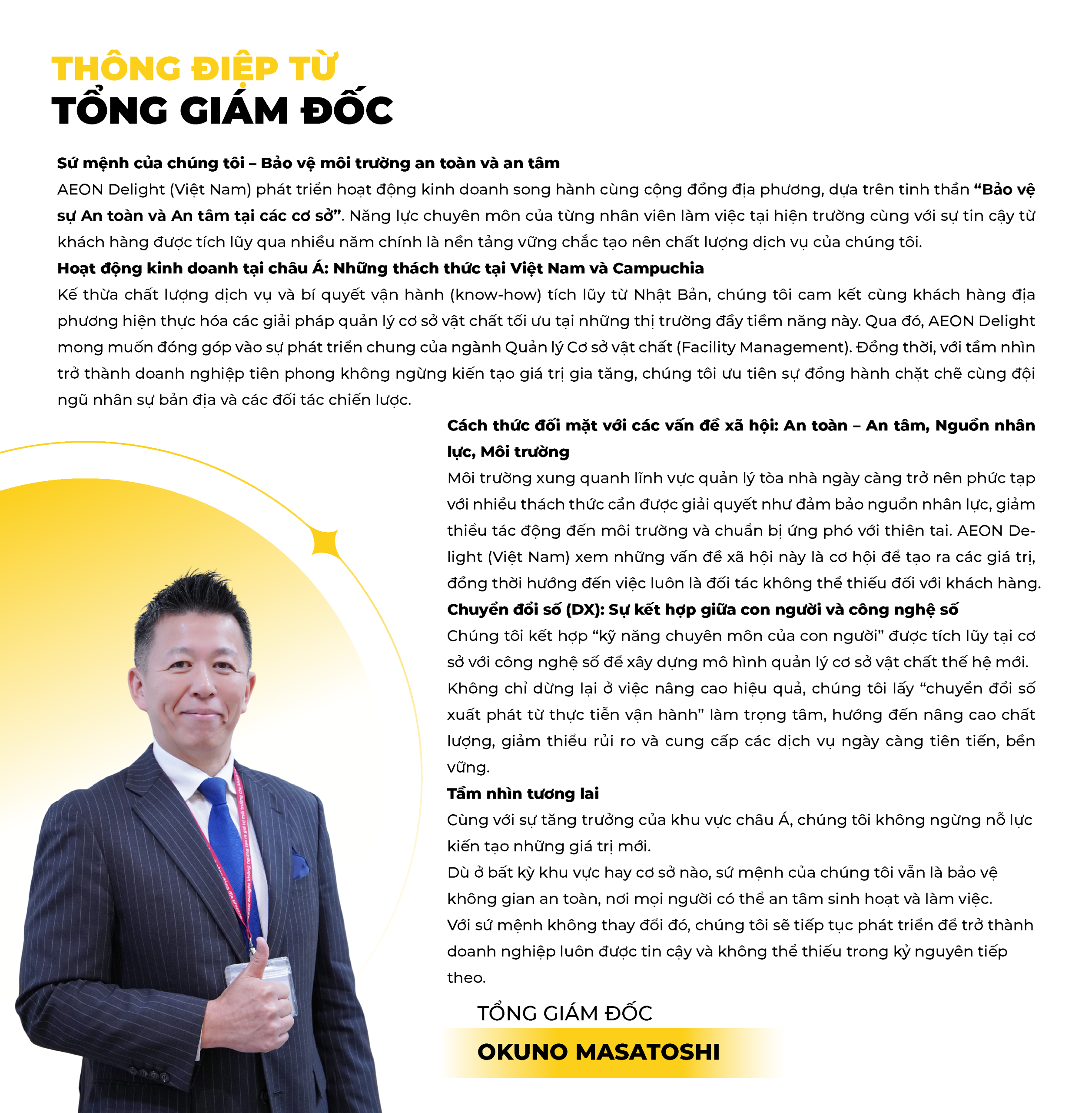 “AEON Delight Vietnam provides the facility management services on the basis of nearly 50 years experience in Japan – providing one-stop, integrated facility management services for diverse customers, such as shopping centers, buildings, offices, residential areas, restaurants, schools, hospitals and industrial sites/factories,… throughout Asia.”